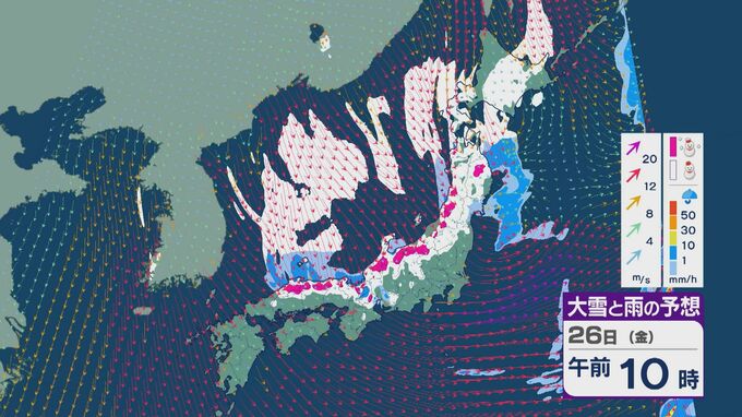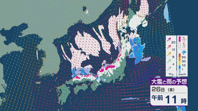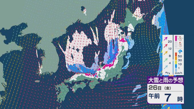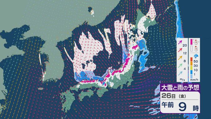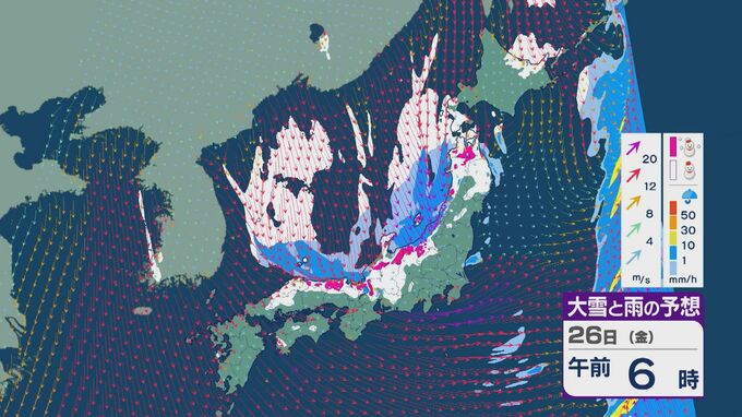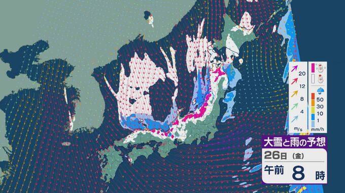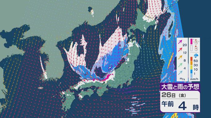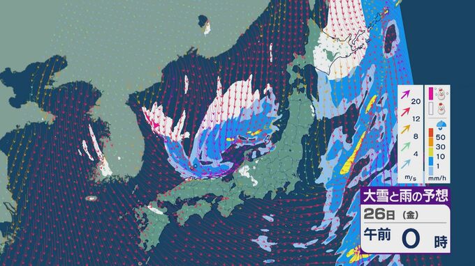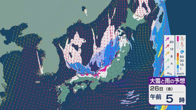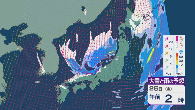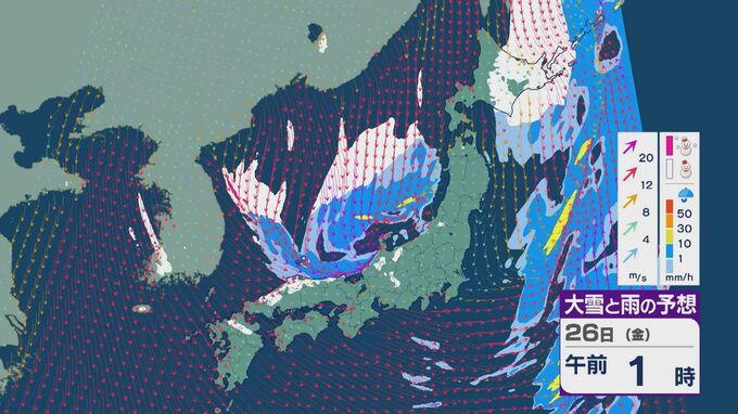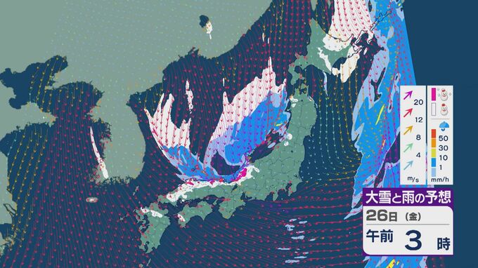 雪の降りやすい状況で、26日の雪・雨と風の予想を見ると、未明からは日本海の西部で風が収束して発生、発達した雪雲が山陰に流れ込みそうです。