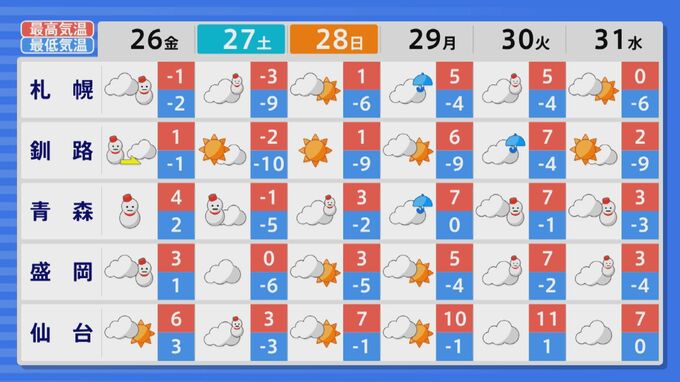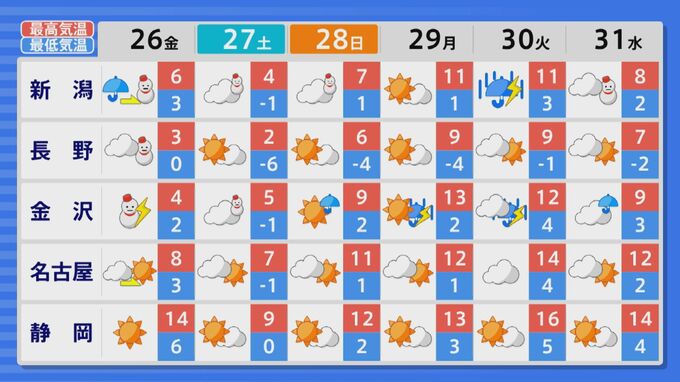 27日(土)の金沢の最低気温は-1度と、平年より3度あまり低い予想です。クリスマスの少し暖かさを感じる気温から一変しそうです。