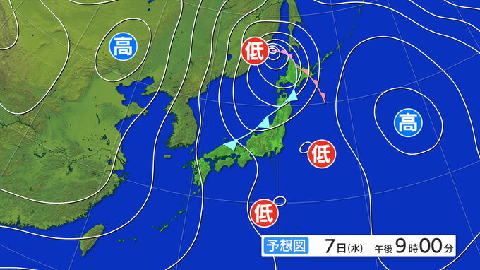 7日午後9時の予想天気図です。日中は日本海の北部を低気圧が北東よりに進みますが、急速に発達する見込みです。