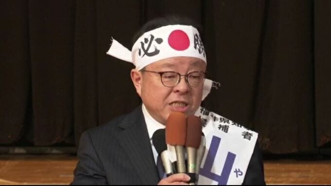 山田賢一候補(無所属・新)「セクハラは撲滅しなければいけません。ゼロハラスメント社会、これを作らなければいけない。改めてそう思った。福井県の幸福度ナンバーワン、これをさらに伸ばして市政においても実行した幸福実感県政を何とか進めたい」