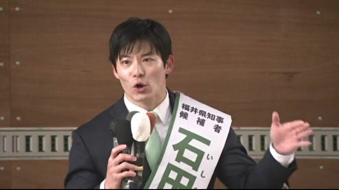 石田嵩人候補(無所属・新)「自分が自分が先頭に立って世代を越えた福井、世代を越えて皆さん一人一人と新しい福井を作りたいから私は帰って来た。もう武者震いですよ今、武者震いで体が震えています。絶対にやってやる、絶対に勝ってやる」