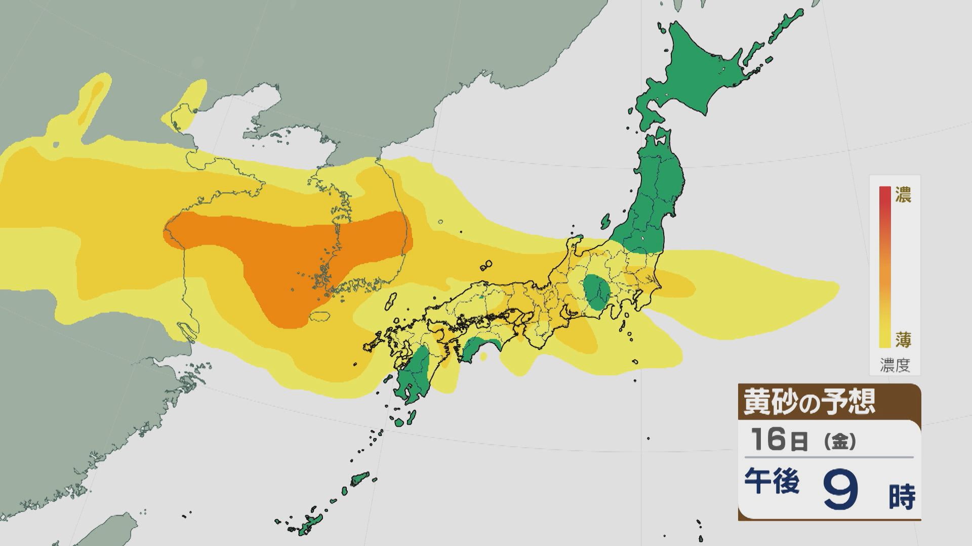 【黄砂情報】大陸からの“季節外れの黄砂”の飛来は16日(金)から17日(土)にかけてピークに 九州から東北南部の広範囲に及ぶおそれ 最新の飛来予想シミュレーション 2026年1月15日(木) 09:15 石川 16日は、未明から九州から東北南部にかけて黄砂が飛来し、中国地方や近畿北部、東海・北陸などでは比較的濃度が高くなっています。