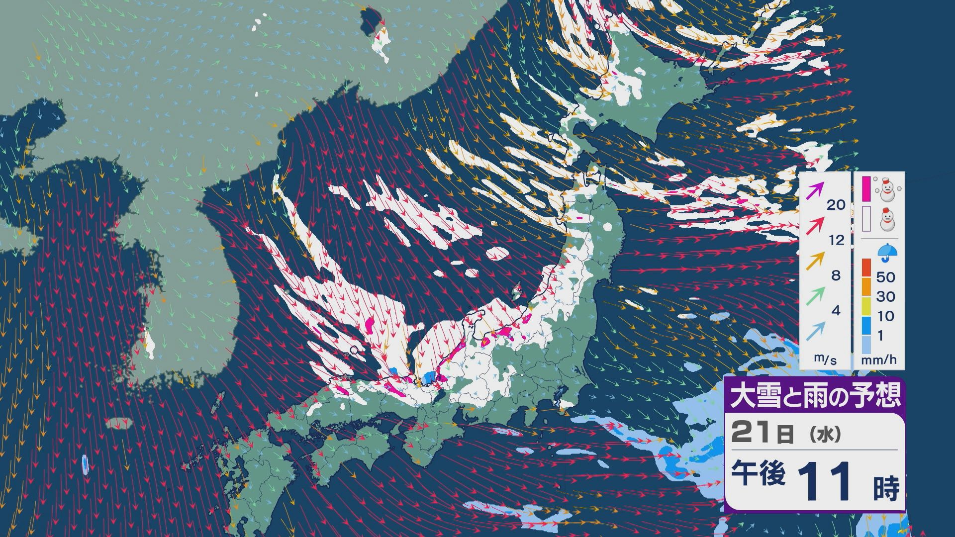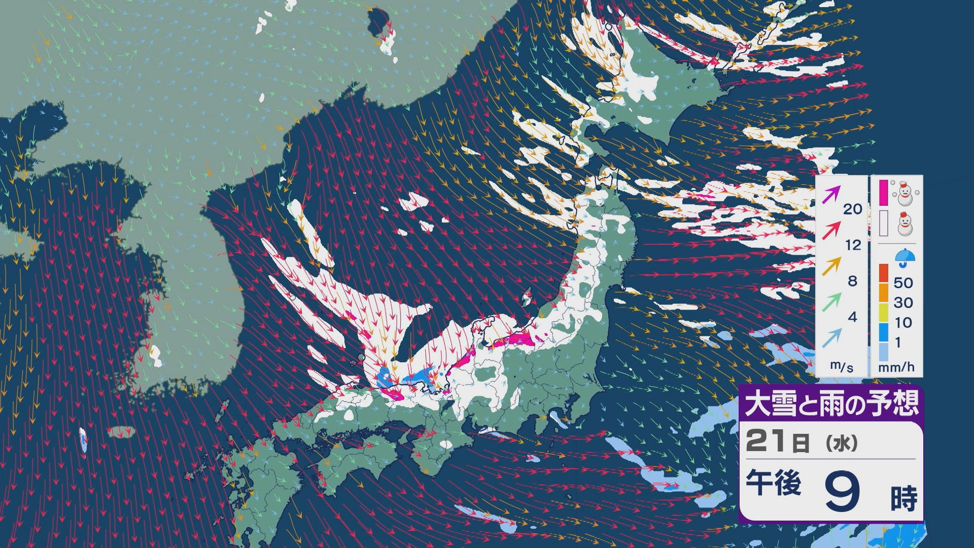21日は、日本海側では一日を通して雪が降るでしょう。沿岸部を中心に風が強まるところもありそうです。昼過ぎからは、日本海で風が収束することで雪雲が発生するJPCZ(日本海寒帯気団収束帯)の影響を受けそうです。山陰や近畿北部、北陸の福井県あたりに発達した雪雲がかかりそうです。