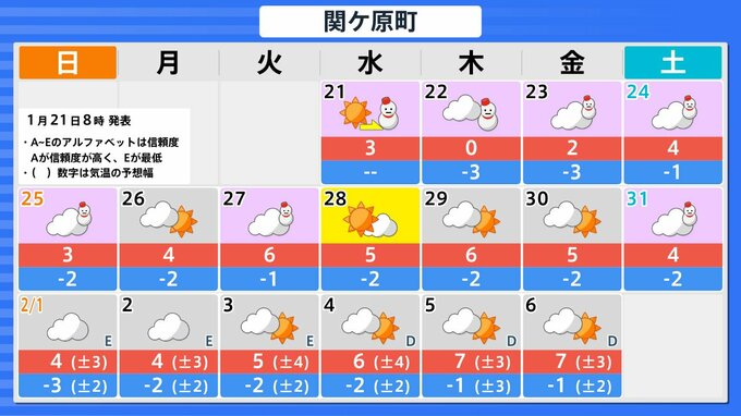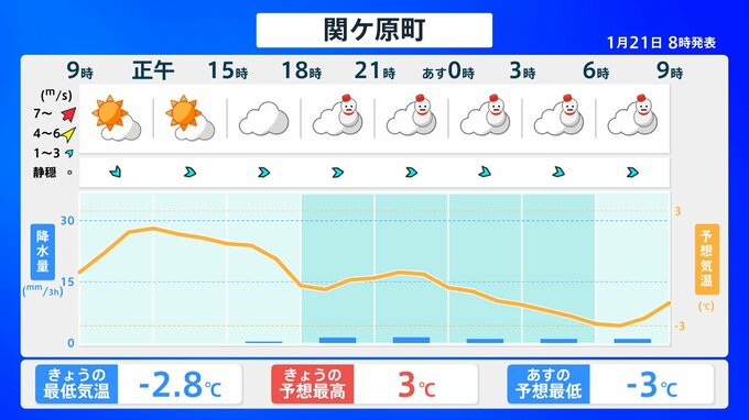 岐阜県の美濃地方では雪が降る見込みです。東海道新幹線が通る関ケ原町でも21日の夜遅くから22日にかけて雪が降るでしょう。