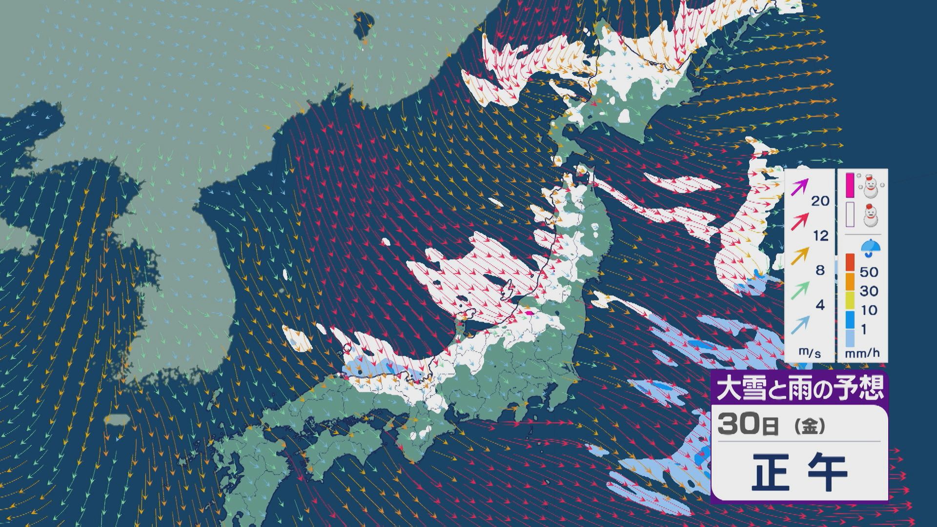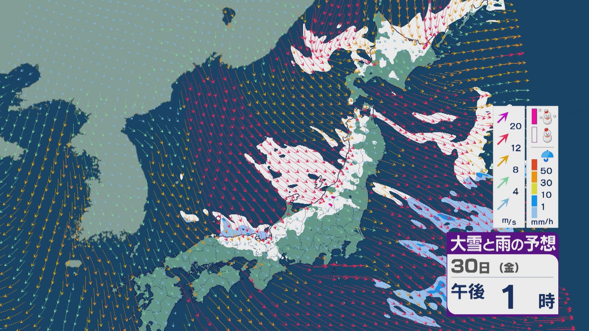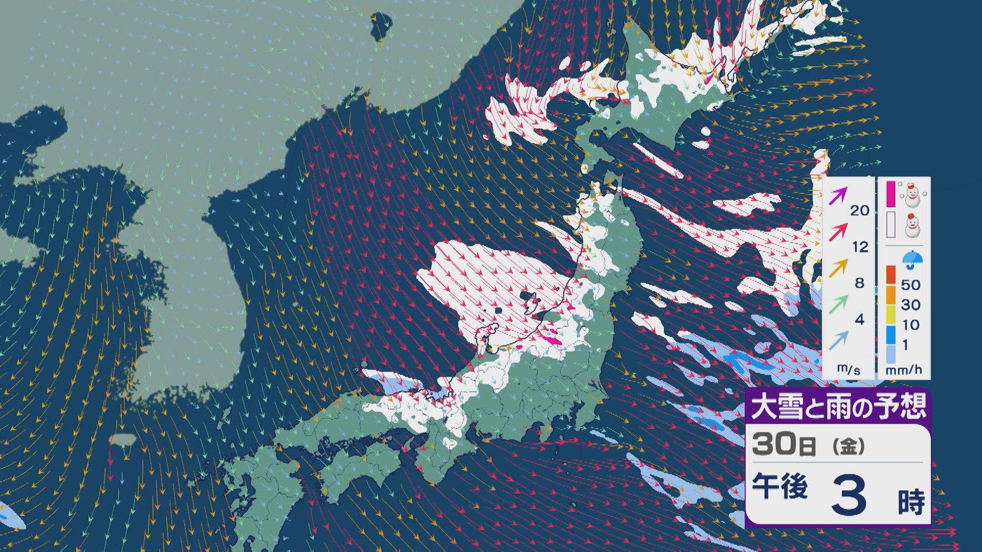 【大雪情報】日本海側は荒れる週の後半に 28日(水)以降“冬型気圧配置”と“強い寒気”が到来 発達した雪雲が北陸などに流れ込むおそれ 積み重なる雪に注意・警戒を 雪と風シミュレーション 2026年1月27日(火) 13:05 石川 30日(金)も、山陰や近畿北部、北陸から東北の日本海側では、北西の風が強く一日を通して雪が降るでしょう。