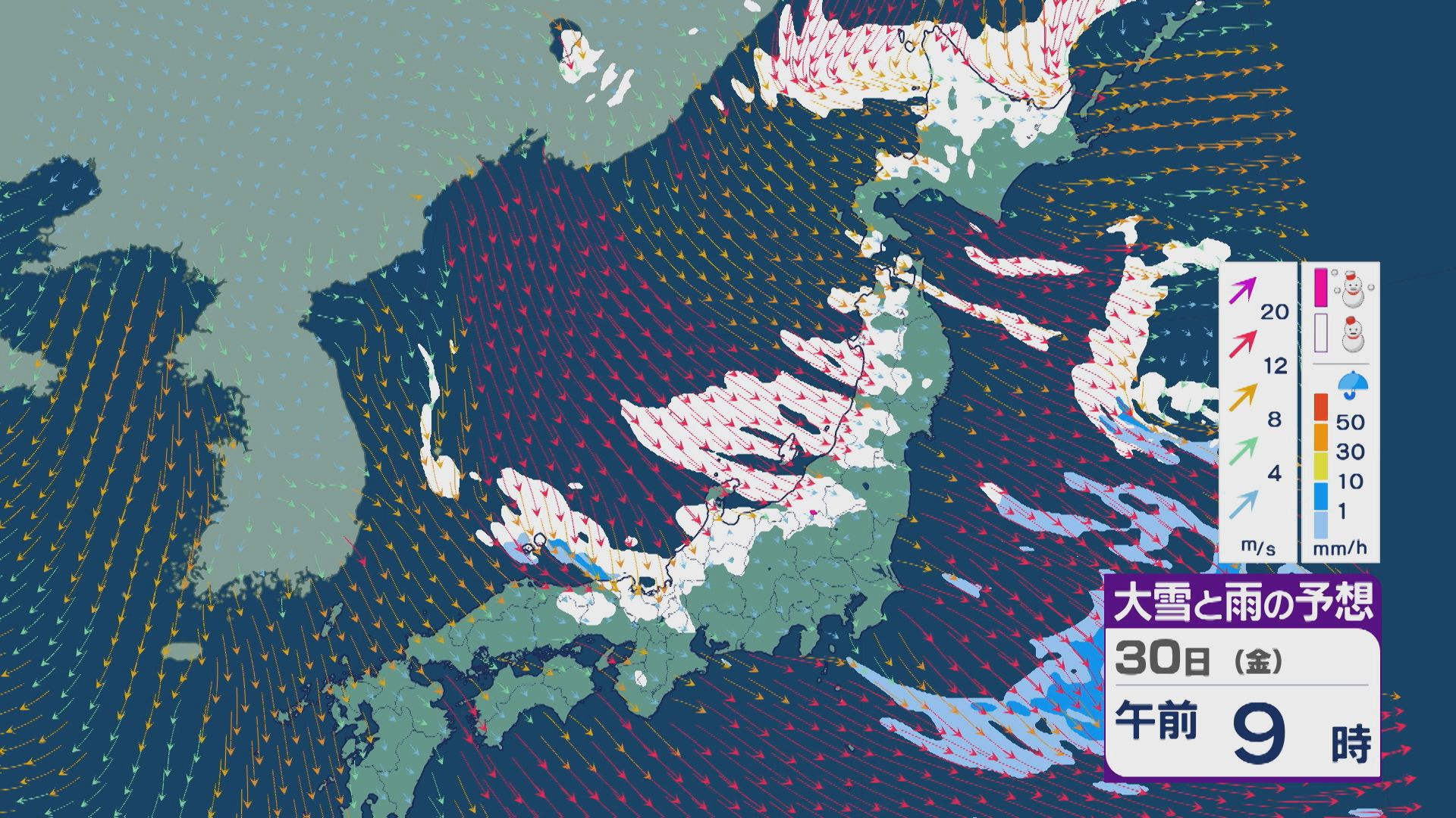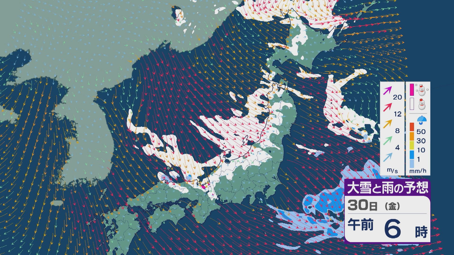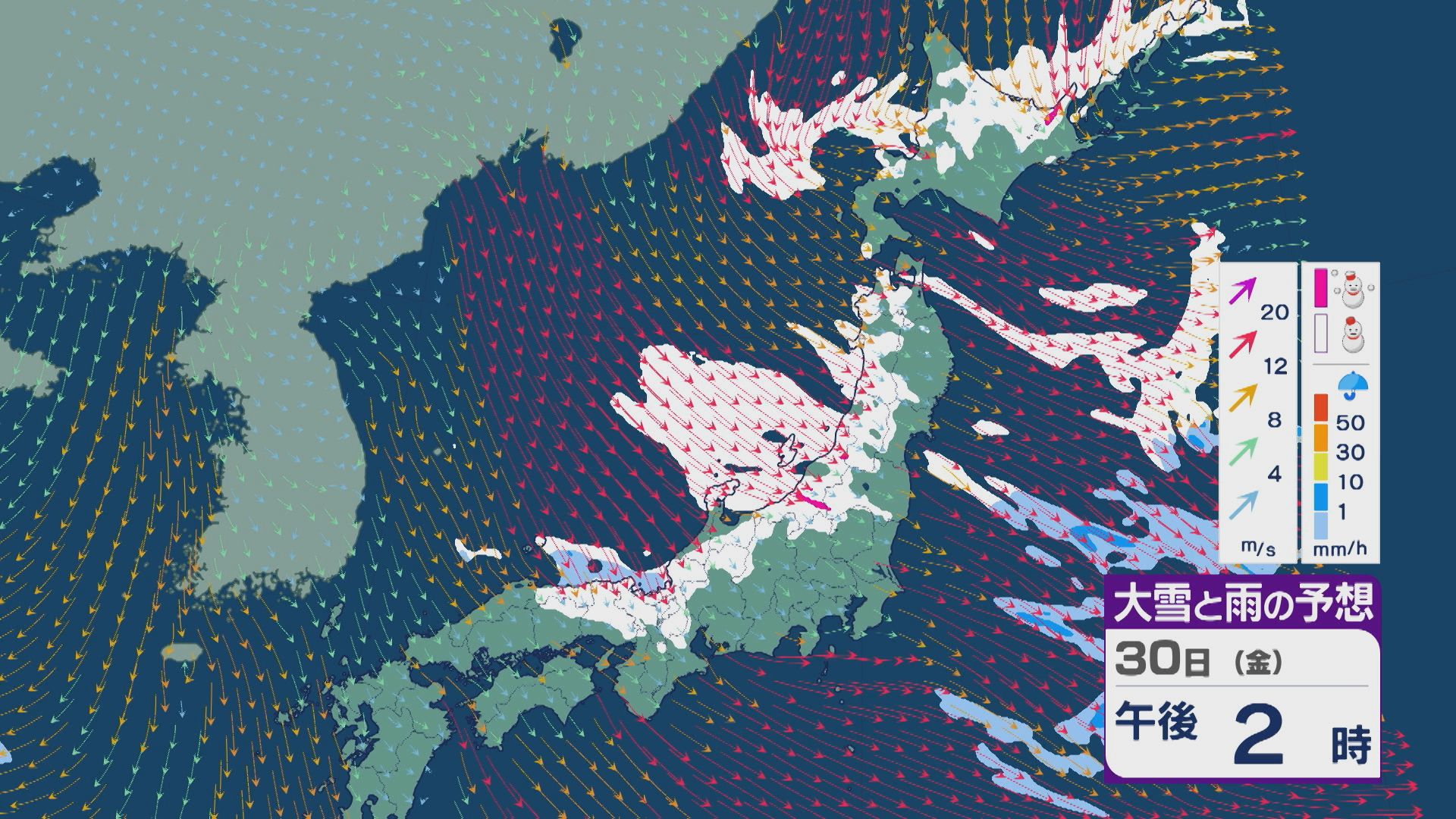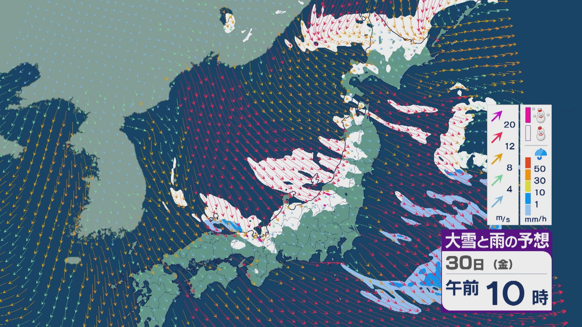 【大雪情報】日本海側は荒れる週の後半に 28日(水)以降“冬型気圧配置”と“強い寒気”が到来 発達した雪雲が北陸などに流れ込むおそれ 積み重なる雪に注意・警戒を 雪と風シミュレーション 2026年1月27日(火) 13:05 石川 30日(金)も、山陰や近畿北部、北陸から東北の日本海側では、北西の風が強く一日を通して雪が降るでしょう。
