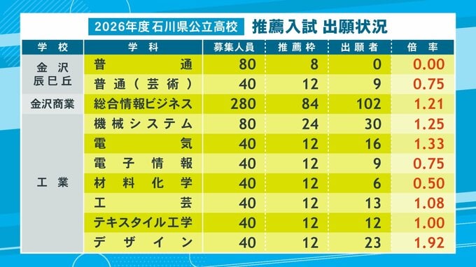 ▼金沢辰巳丘:普通科 0.00倍、芸術コース 0.75倍