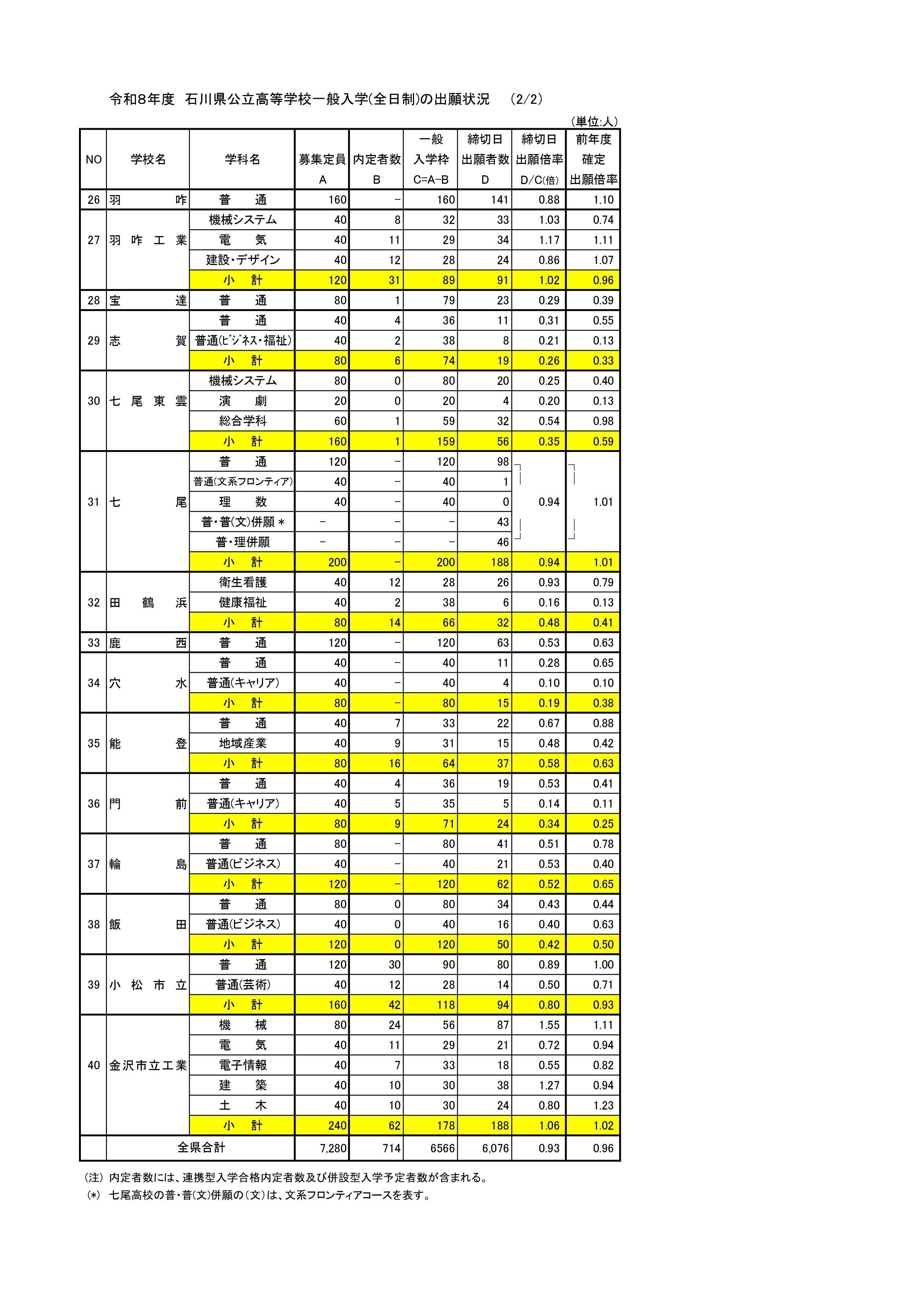 【全校の倍率2026】石川県公立高校一般入試2026 金沢桜丘が1.45倍 金沢錦丘が1.44倍…令和8年度の出願状況 2026年2月24日(火) 17:23 石川 志願倍率が高い高校は?前年比の倍率は?各高校一覧 出願倍率は金沢桜丘が最も高く1.45倍、次いで、金沢錦丘、金沢二水の順になっています。 出願の変更期間は27日から3月3日の午後3時までです。入学試験は3月10日と11日に行われ、合格者は18日の正午に発表されます。