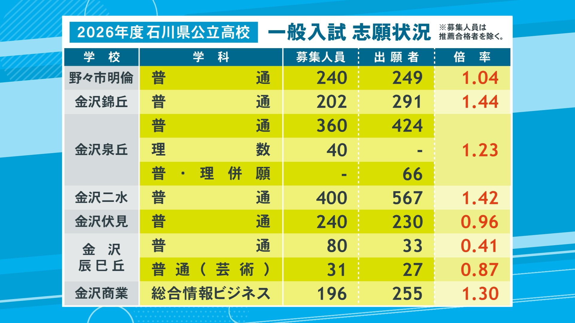 ▼金沢泉丘:普通科、理数科それに併願の全体の倍率は1.23倍です。