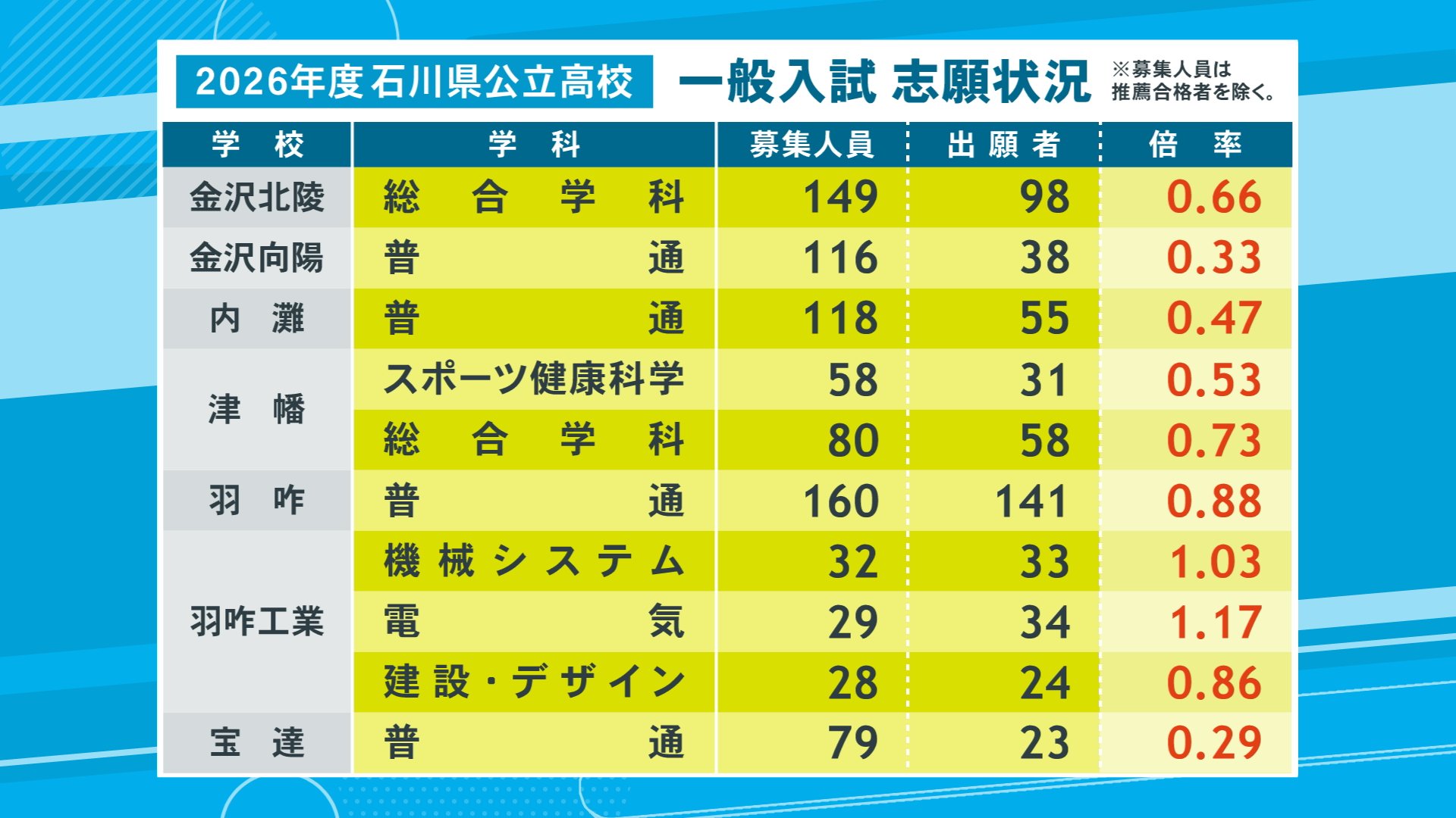▼津幡:スポーツ健康科学科0.53倍、総合学科0.73倍
