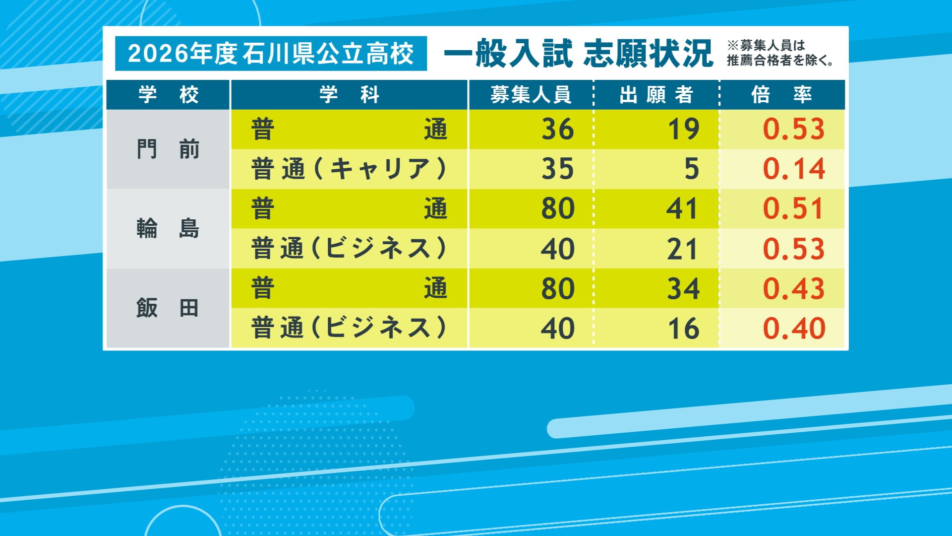 【全校の倍率2026】石川県公立高校一般入試2026 金沢桜丘が1.45倍 金沢錦丘が1.44倍…令和8年度の出願状況 2026年2月24日(火) 17:23 石川 【学校別の一覧】門前・普通 0.53倍、輪島・普通(ビジネス)0.53倍 ▼門前:普通科0.53倍、キャリアコース0.14倍 ▼輪島:普通科0.51倍、ビジネスコース0.53倍 ▼飯田:普通科0.43倍ビジネスコース0.40倍