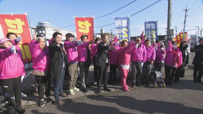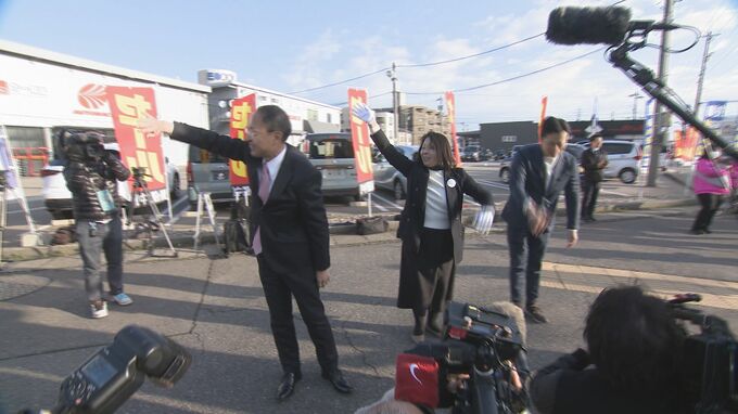 山野さんは9日午前7時半、金沢市内の選挙事務所近くの交差点で、選挙戦を共に戦った家族やボランティアのメンバーとともに、有権者への感謝と県政への決意を伝えていました。