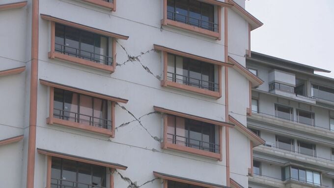 久々江龍飛フィールドキャスター「高さ70メートルを超える、和倉温泉を象徴する加賀屋。壁面は大きな亀裂がいくつも確認できます。来月上旬からの解体工事でついに姿を消すことになります」