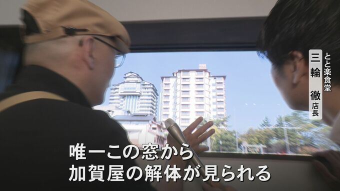 とと楽食堂・三輪徹店長…「唯一この窓から加賀屋の解体が見られます」(解体が始まったばかりだが、寂しさは?)「長く世話になった旅館なので、色々考えることもある」