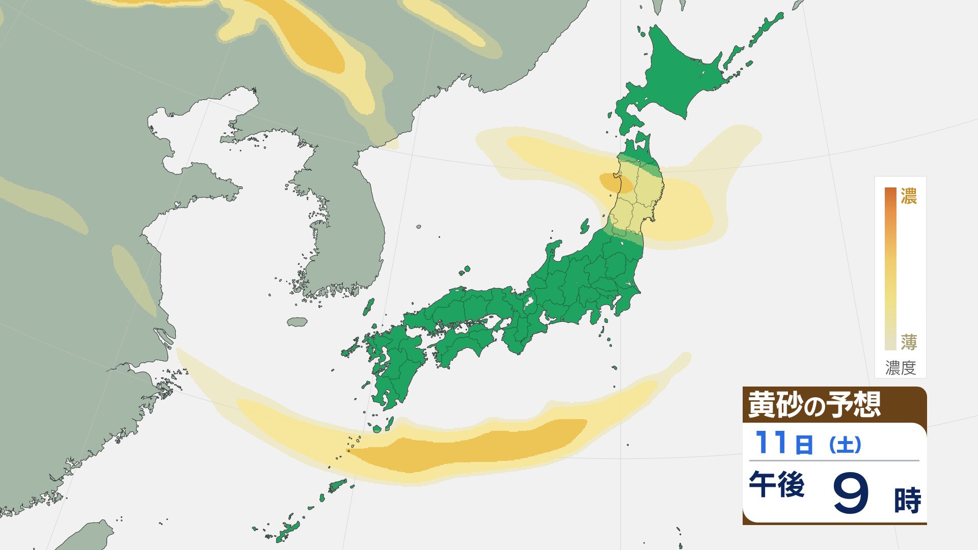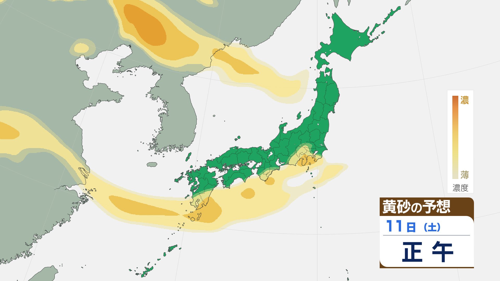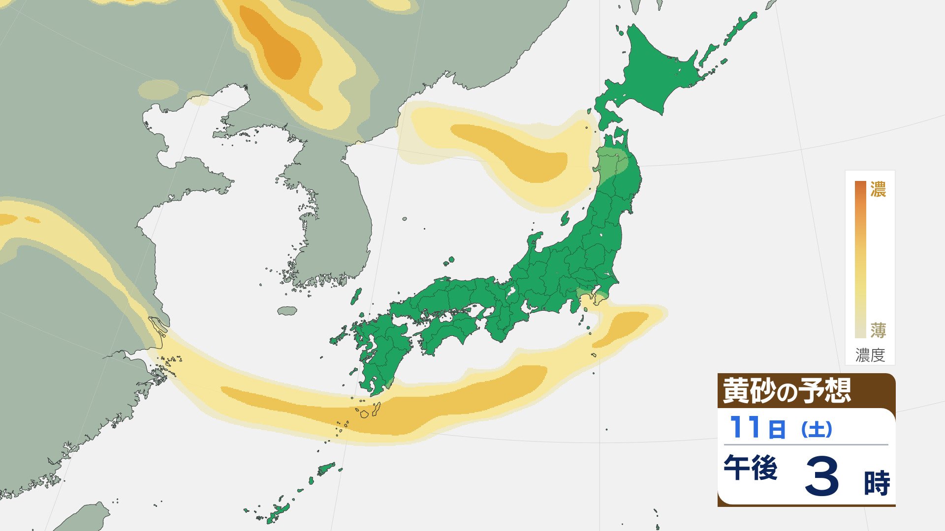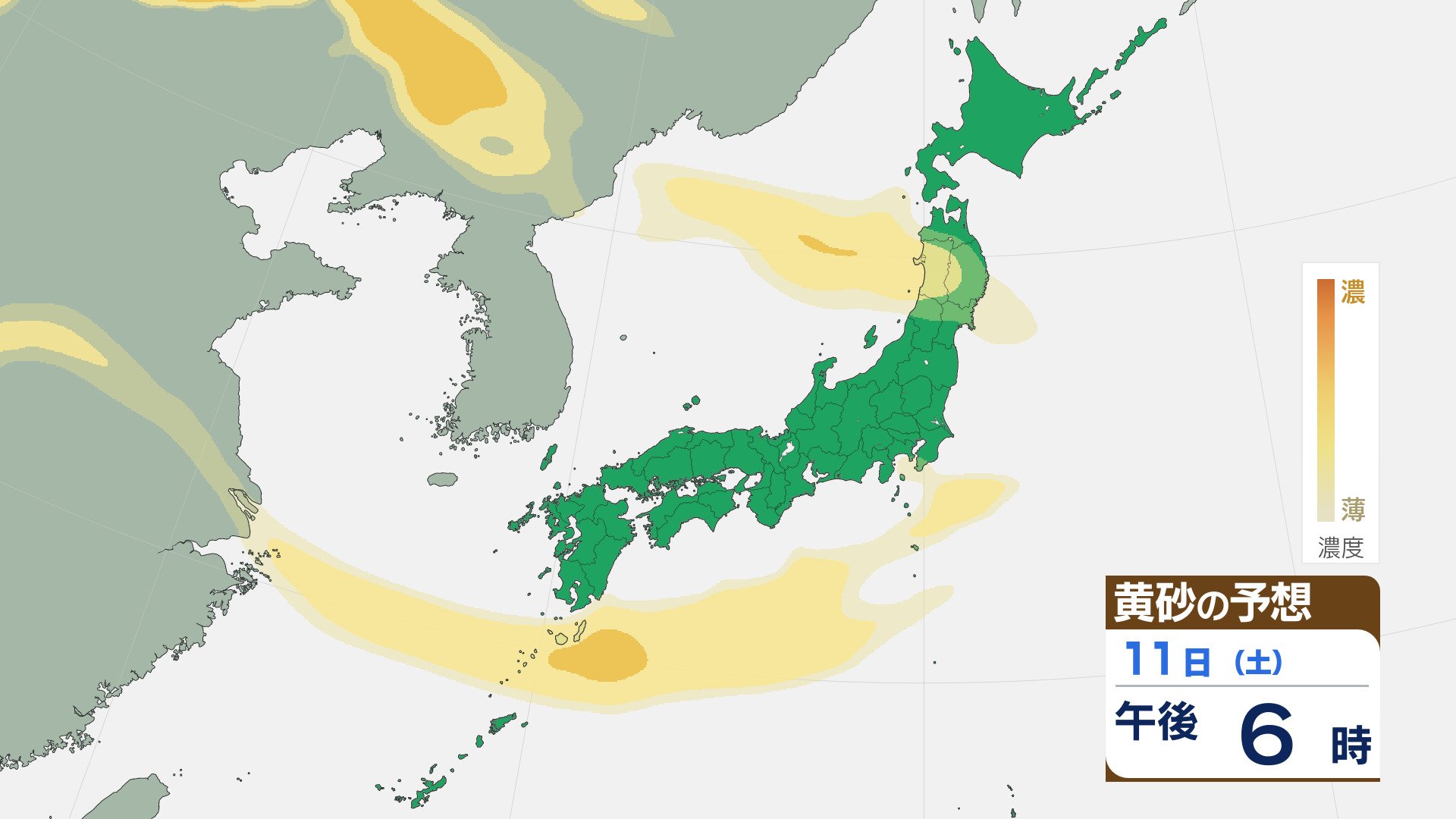 【黄砂情報】大陸からの黄砂は10日(金)に九州北部や中国地方へ 11日(土)は四国や近畿・関東でも飛来する見込み 飛来予想シミュレーション 2026年4月8日(水) 15:12 石川 11日は、未明から黄砂の跳ぶ範囲が四国や近畿にも広がりそうです。 朝からは、関東にも黄砂が達しそうです。九州から関東の太平洋側で、昼過ぎまで黄砂の飛来が続きそうです。夕方以降は、東北でも黄砂が確認されそうです。
