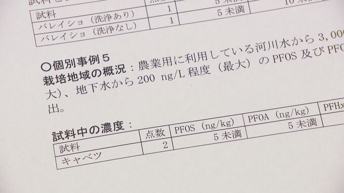このように話す長谷川教授が見せてくれたのが、農林水産省が公開しているは200ナノグラム程度のPFASを含む地下水をまいて育てたキャベツのPFAS残留濃度は5ナノグラム未満だったという報告書です。