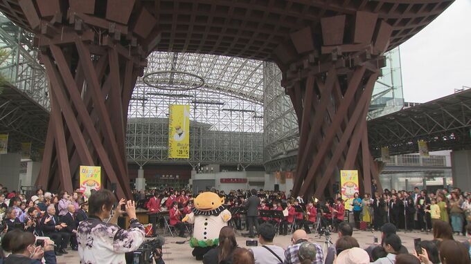28日に開幕したばかりの「ガルガンチュア音楽祭」。29日は金沢龍谷高校吹奏楽部が金沢駅前で開幕を祝うファンファーレを演奏しました。
