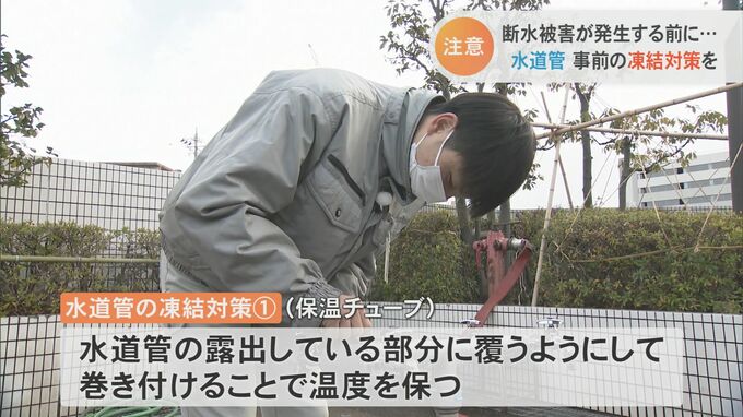 対策の1つが保温チューブ。水道管の露出している部分に覆うようにして巻き付けることで、温度を保ちます。また、身近にあるタオルなどの布で代用しても凍結を防ぐことができます。なるべく隙間なく巻き付けるのがポイントだといいます。