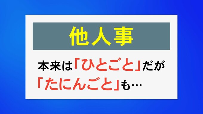 次は、他人事=ひとごとです。元々漢字で「他人事」と書いて「ひとごと」と読みますが、今は「たにんごと」とそのままの読み方が増えています。