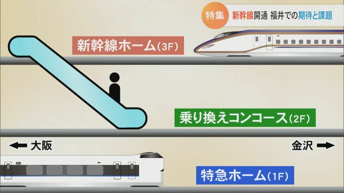 福井県によりますと、例えば福井駅から大阪駅までの所要時間は、これまでのサンダーバード直通よりも15分短縮されますが、乗り換えでおよそ10分かかることになります。このため、「時間短縮効果」よりも「乗り換えの負担」が大きいと感じている人の割合が高いという結果が出ました。