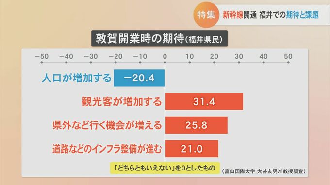 敦賀開業時の期待という問いに対しては、「観光客が増加する」「県外など遠くに行く機会が増える」「道路などのインフラ整備が進む」と答えた人が多く、期待感は大きいようです。