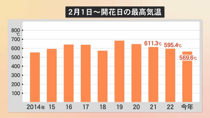 金沢市の2月1日から開花日までの最高気温を見ると、2021年は611.3度、22年は595.4度で、ほとんどドンピシャでした。