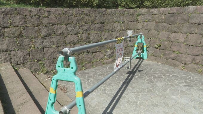 バリケードで塞がれた金沢城公園の百間堀園地=2021年3月