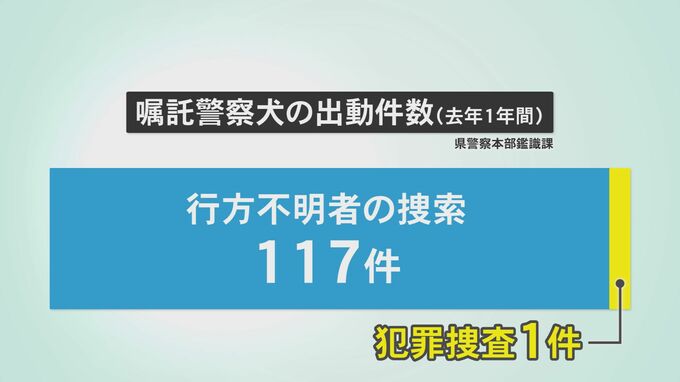嘱託警察犬は警察からの要請を受けて出動し、去年1年の出動件数は118回にのぼります。このうち、行方不明者の捜索が117件、犯罪捜査が1件となっています。