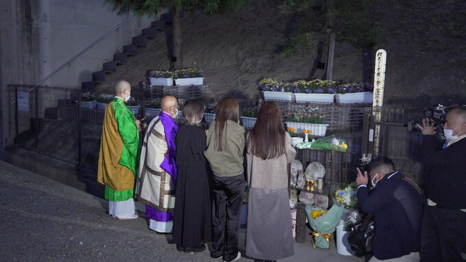 午前4時40分に合わせて道路下に設けられた献花台に花を手向け、手を合わせていました。