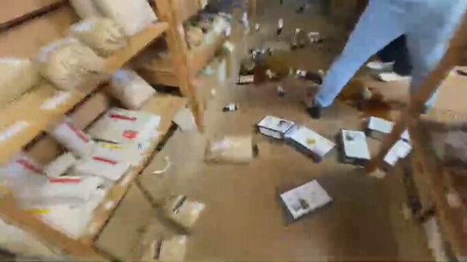 大きく揺れる蛍光灯。珠洲市野々江町の道の駅すずなりでは、棚から落ちた商品が店内に散乱しました。訪れていた人たちは不安そうに店の外へと非難している様子が分かります。