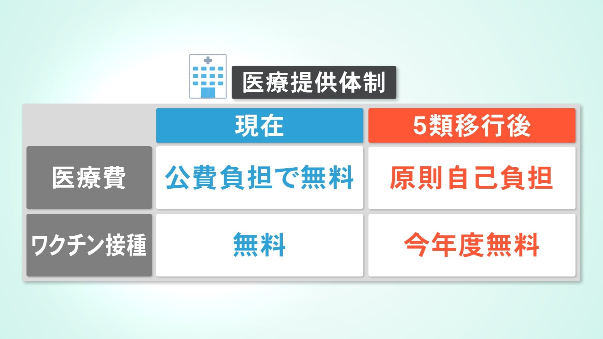次に医療費です。現在、公費で全額支援し無料となっていますが今後、原則自己負担となります。また、無料となっているワクチン接種については今年度は無料が継続されます。