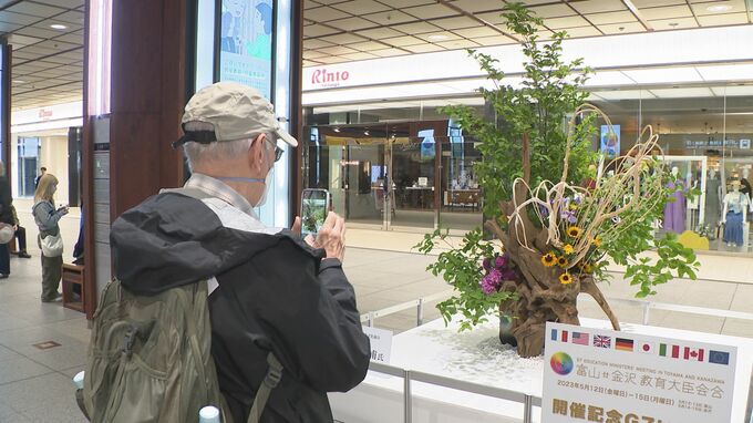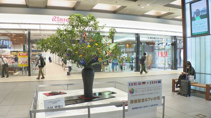 12日から始まったG7富山・金沢教育大臣会合の開催機運を盛り上げるためJR金沢駅構内にいけ花の大作2点が今、展示されています。