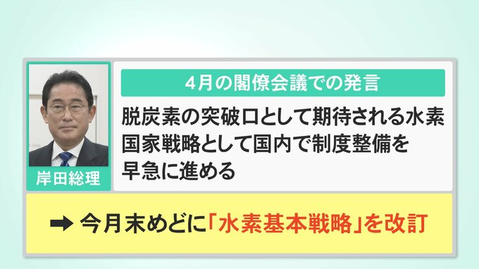 この水素に関しては、国も本腰を入れていて岸田総理が4月の再生可能エネルギー・水素等関係閣僚会議で「脱炭素の突破口として期待される水素については、世界に先駆けた国家戦略として、国内では規制や支援一体型で制度整備を早急に進める」と話し、5月末を目処に「水素基本戦略」を改訂するとしています。