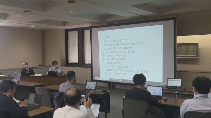 加賀市役所では午前中、各部のリーダー級の職員を対象にチャットGPTの運用面の注意点などについて説明会が開かれました。チャットGPTは、人工知能技術で集積した様々な知識を活用し、ユーザーに最適な情報を提供してくれるとして注目されています。加賀市では、4月からイノベーション推進部で試験的に導入していて、業務効率の効果が確認できたとして全庁的に取り入れることにしました。