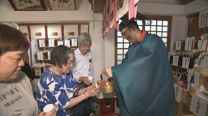 神事の最後には、清められた生姜湯が作られ、宮司らが口にした後、天下泰平を願って皿を割る「直会」の儀が行われました。県内外から食品会社や生産者も訪れ、香辛料の神様に無病息災を願いながら生姜湯を味わっていました。