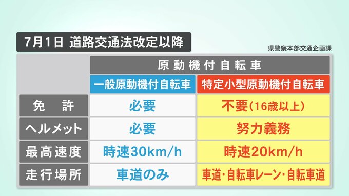 「自転車の仲間と理解されている方もいらっしゃるかもしれませんがあくまでも新しい原付の一種ということでしっかり車両としてのルールを守ってもらう必要がある」免許が不要となるのは、最高速度が時速20キロ以上が出ない仕組みになっているもの。