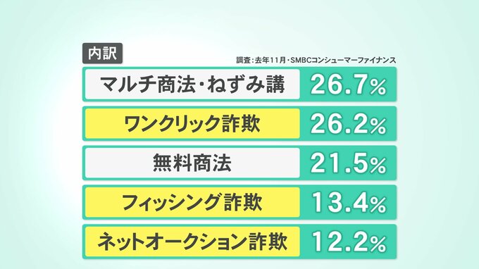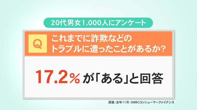 SMBCコンシューマーファイナンスが去年11月、20代の男女1000人を対象に行った調査では、全体の2割近くが詐欺などのトラブルの被害を受けたことがあると答えました。中でもワンクリック詐欺やフィッシング詐欺、ネットオークション詐欺などインターネットを介した手口が多く見受けられます。