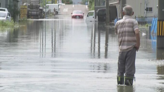 内灘町西荒屋では、道路が広範囲にわたって冠水し、水没した車が動けなくなっていました。中に人は乗っていませんでした。近くに住む人は「昨夜9時か10時ごろからこんな感じ。10年ほど前にもあったが、ここまでではなかった」と話していました。
