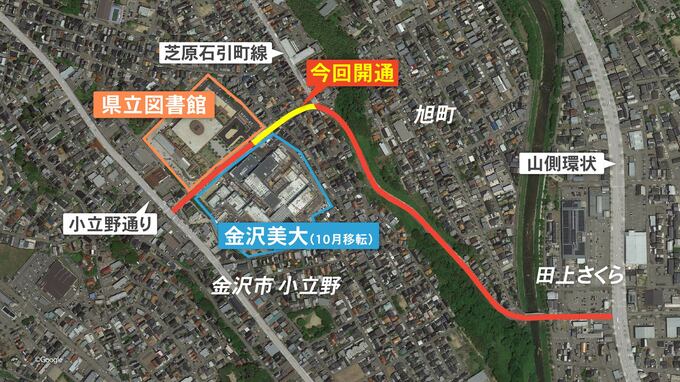 県立図書館が去年7月に金沢市小立野に移転して以降、山側環状側が行き止まりとなっていたため、周辺の道路が図書館の利用者で渋滞し、石川県は今年の夏休み前の開通を目指していました。