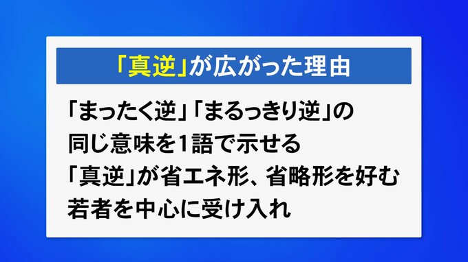 はじめのうちは、『三省堂国語辞典』の注記にもあるように、話し言葉で俗語的に使われることが多かったのですが、最近では「考え方が私とは真逆だ」とか「これまでのものとは真逆の結論」のように、書き言葉での使用例も見かけるようになりました。「逆」であることを強調する場合は、「まったく逆」とか「まるっきり逆」のように副詞を付けて言う言い方が従来からもあったわけですが、同じような意味を簡潔に一語で表せる「真逆」が、インパクトのある表現、省エネ型の省略形を好む若者世代を中心に徐々に受け入れられたものと考えられます。