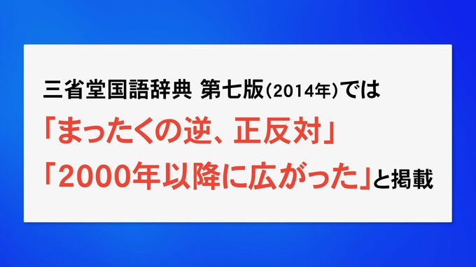 国語辞典でも、「俗語」などと断った上で取り上げているものが増えていて、新しい言葉を積極的に採用することで知られる『三省堂国語辞典 第七版』(2014年)では「真逆」を見出し語として立てて、「まったくの逆。正反対。」という意味とともに「2000年以降に広まったことば」との注記があります。