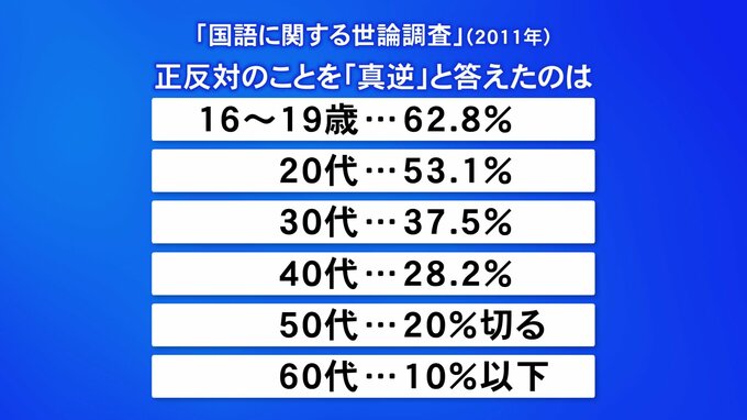 ただ、このコーナーで時々紹介している文化庁が毎年実施している「国語に関する世論調査」でも、2011年度の調査で「真逆」について取り上げていて、その調査では、「正反対」のことを「真逆」と言うと答えた人はまだ全体の22.1%でした。世代別に見ると、最も多かったのが16~19歳で62.8%、20代で53.1%、30代で37.5%、40代で28.2%、50代で20%を切り、60代以上だと10%以下という結果でした。10年ほど前の調査ですが、この結果からは、まだ「真逆」が多数派になっているとは言えない状況であることもお分かりいただけるだろうと思います。
