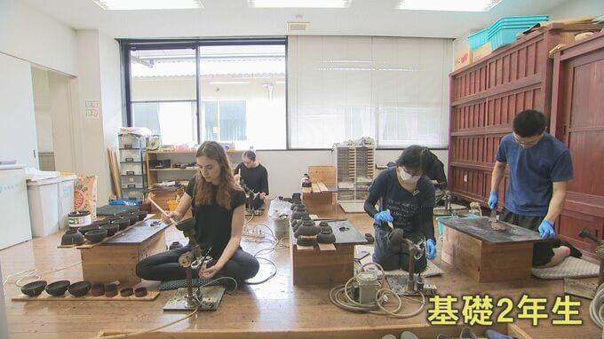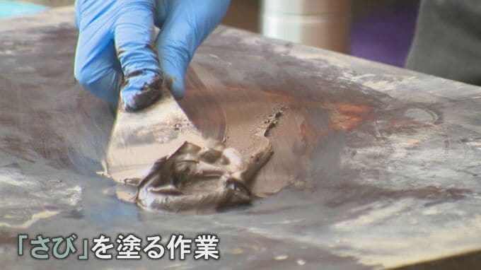 学生たちがおよそ半年間かけて取り組んでいるのは、漆や砥の粉を練り合わせた「錆」を塗る作業です。漆器を丈夫で長持ちさせるために大事な作業の一つですが、ヘラの扱い方ひとつで仕上がりが変わるため、プロの職人でも非常に難しい工程だそうです。