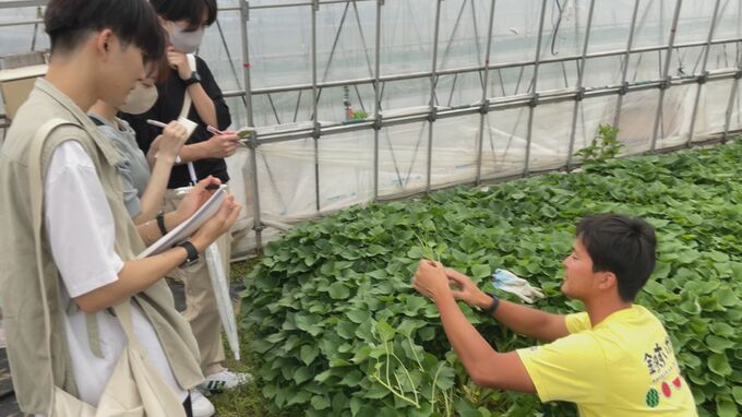 化粧品の製造は大阪の会社に委託。学生は農家の取材やメディアの対応をするリアルマーケティング班や、商品パッケージを担当するデザイン班など4つの班に分かれて開発を進めています。生産農家も開発に期待を込めています。「こういう苗は畑に使えない。こういうのをぜひ使ってもらって化粧品出来たらいい」今年6月、上旬には金沢市粟崎町の生産農家でサツマイモの苗のせん定作業を体験しました。