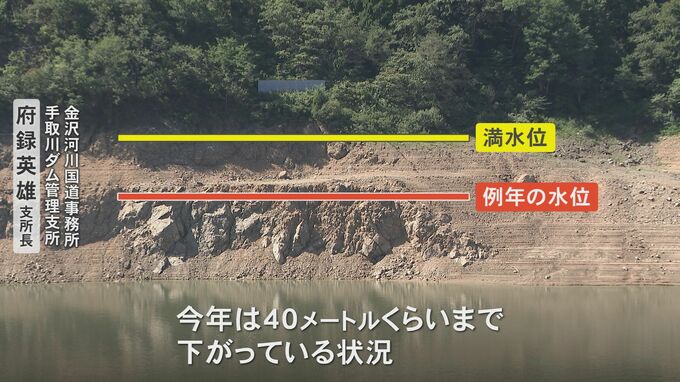 「国内で最大級、石川県の水がめとも呼ばれる手取川ダムですが、岩肌が露出していて水位がかなり下がっていることが分かります」