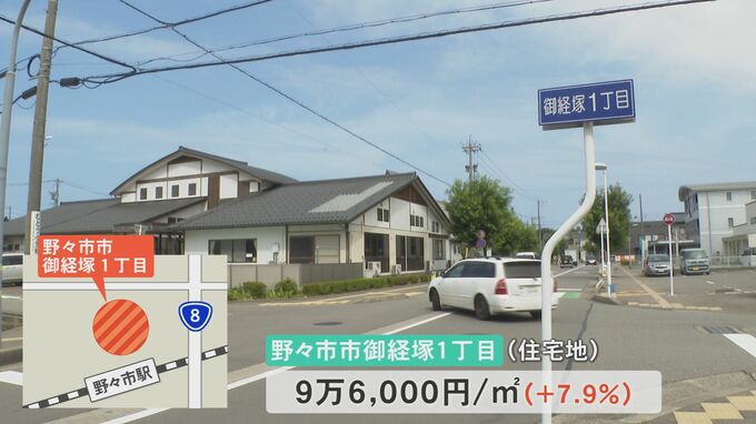 野々市市御経塚1丁目は1平方メートルあたり9万6000円となり、変動率は7.9%上昇、上がり幅が最も大きくなりました。