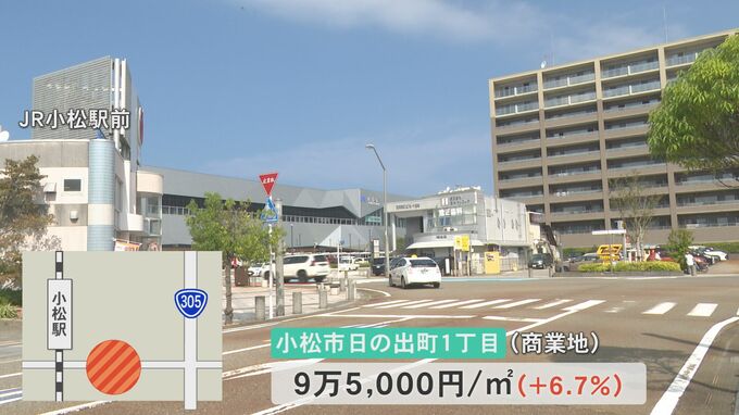 JR小松駅前の小松市日の出町1丁目の上昇率は6.7パーセント。金沢の観光地・東山エリアを抑えて、県内の商業地では最大の上昇率となりました。