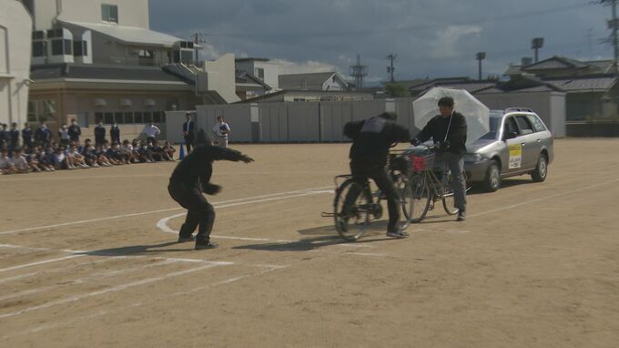スタントマンが自転車による交通事故を再現した交通安全教室が、石川県小松市の中学校で行われました。