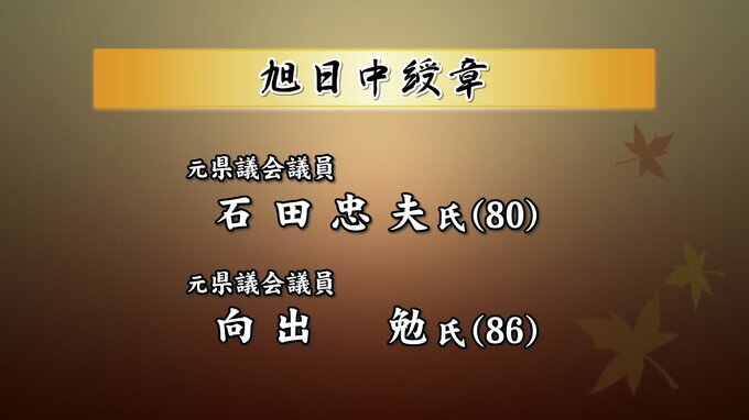 旭日中綬章は、元県議会議員の石田忠夫さんと、同じく元県議会議員の向出勉さんの2人が受章。