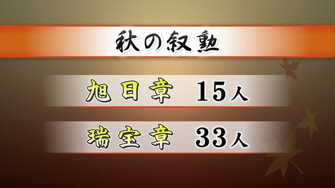様々な分野で顕著な功績をあげた人に贈られる、旭日章には15人が。長年、公共の業務に従事し功労のあった人を讃える瑞宝章は33人が受章しました。